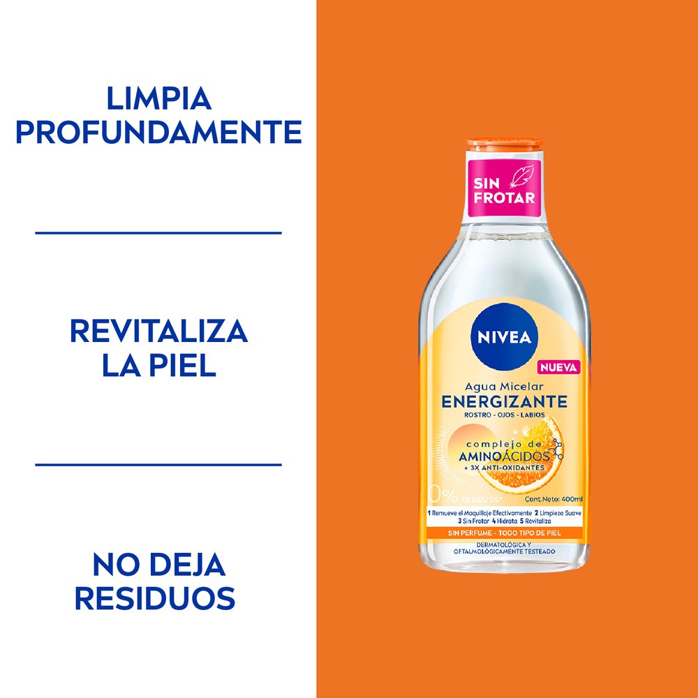 El Agua micelar NIVEA Energizante limpia profundamente y remueve eficazmente el maquillaje de rostro, ojos y labios. Contiene Complejo de Aminoácidos y 3x de Antioxidantes: vitamina C, vitamina B3 y extracto de arándano, ingredientes que energizan y revitalizan la piel, dejándola fresca y suave. El agua micelar hidrata y revitaliza, sin perfume. Su fórmula está libre de microplásticos, 98% biodegradable y su botella está fabricada con un 96% de material reciclado. Es adecuada para todo tipo de pieles, ideal para pieles secas.