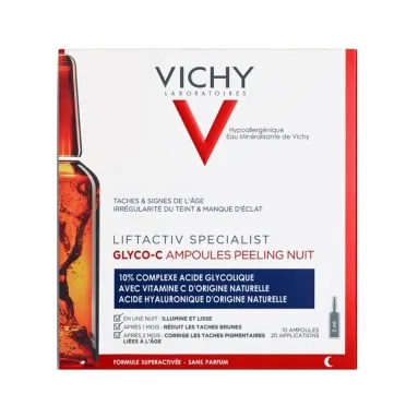 30 ampollas que corrigen las manchas, tono, textura y aportan luminosidad. Alta concentración de activos dermatológicos de origen natural: 10% de A.G, A.H., Vitamina C y Agua Termal Mineralizante de Vichy.