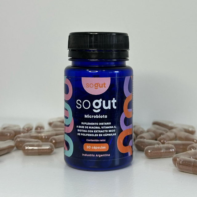 Suplemento natural clínicamente probado que potencia la salud intestinal. Con complejo vitamínico y polifenoles, equilibra la microbiota, reduce distensión, pesadez y flatulencias, y protege contra inflamación. Envase de 30 cápsulas, 1 al día.