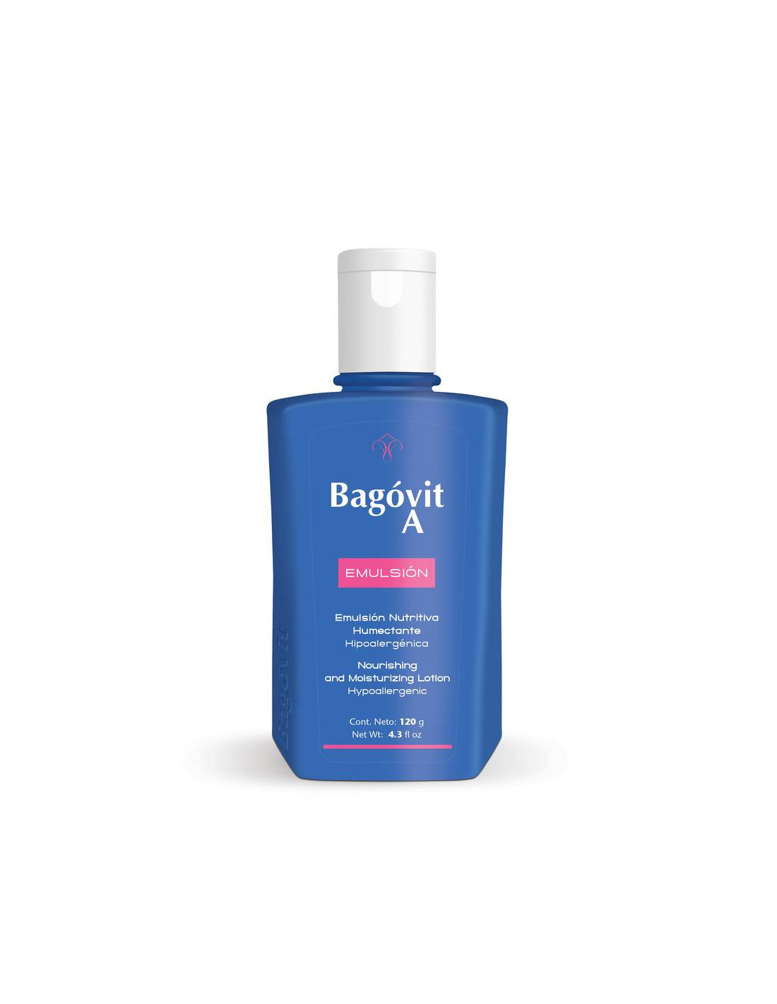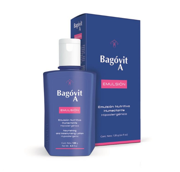 Crema Bagovit A Emulsión Hipoalergénica. La fluidez de su textura y su fórmula hidroemulsionada permiten una rápida penetración de la Vitamina A, favoreciendo una placentera y suave aplicación en todo el cuerpo. Restituye la firmeza, vitalidad y luminosidad de la piel