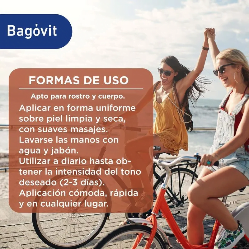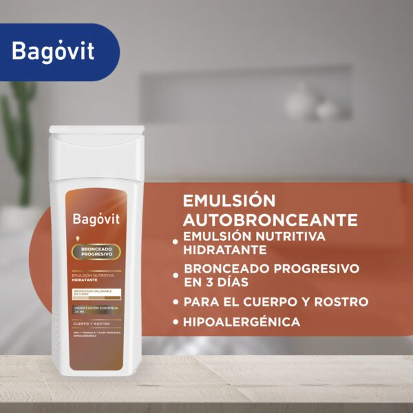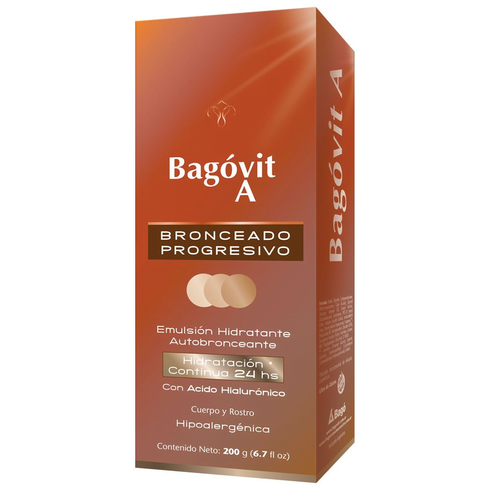 Bagóvit Emulsión Autobronceante para una piel más luminosa y tersa, en 3 días contará con el color ideal de verano sin haber estado expuesta al sol. Hipoalergénica. Su fórmula enriquecida con A.H., Vitaminas A y E, hidrata y nutre profundamente la piel. Al mismo tiempo, brinda un saludable tono bronceado en cualquier momento del año. La piel se verá más luminosa y tersa, en 3 días contará con el color ideal de verano sin haber estado expuesta al sol. Resultado, piel hidratada. Bronceado saludable todo el año.