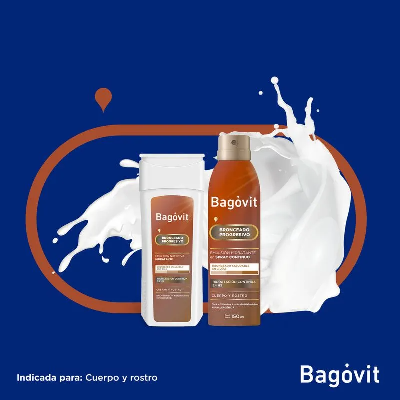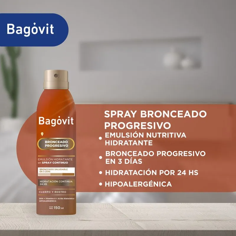 Spray Bagovit A Bronceado Progresivo Hipoalergénico contiene una fórmula enriquecida con A.H. y Vitaminas A y E, que hidratan y nutren tu piel mientras le brindan un tono de bronceado saludable en cualquier momento del año. En tan solo 3 días obtendrás el color ideal sin haber estado expuesta al sol. El A.H. actúa como una “esponja molecular” que retiene el agua brindándole a la piel hidratación continua. Además, estimula la circulación de agua entre las capas de la piel revitalizando y otorgándole suavidad y turgencia. Es hipoalergénico.