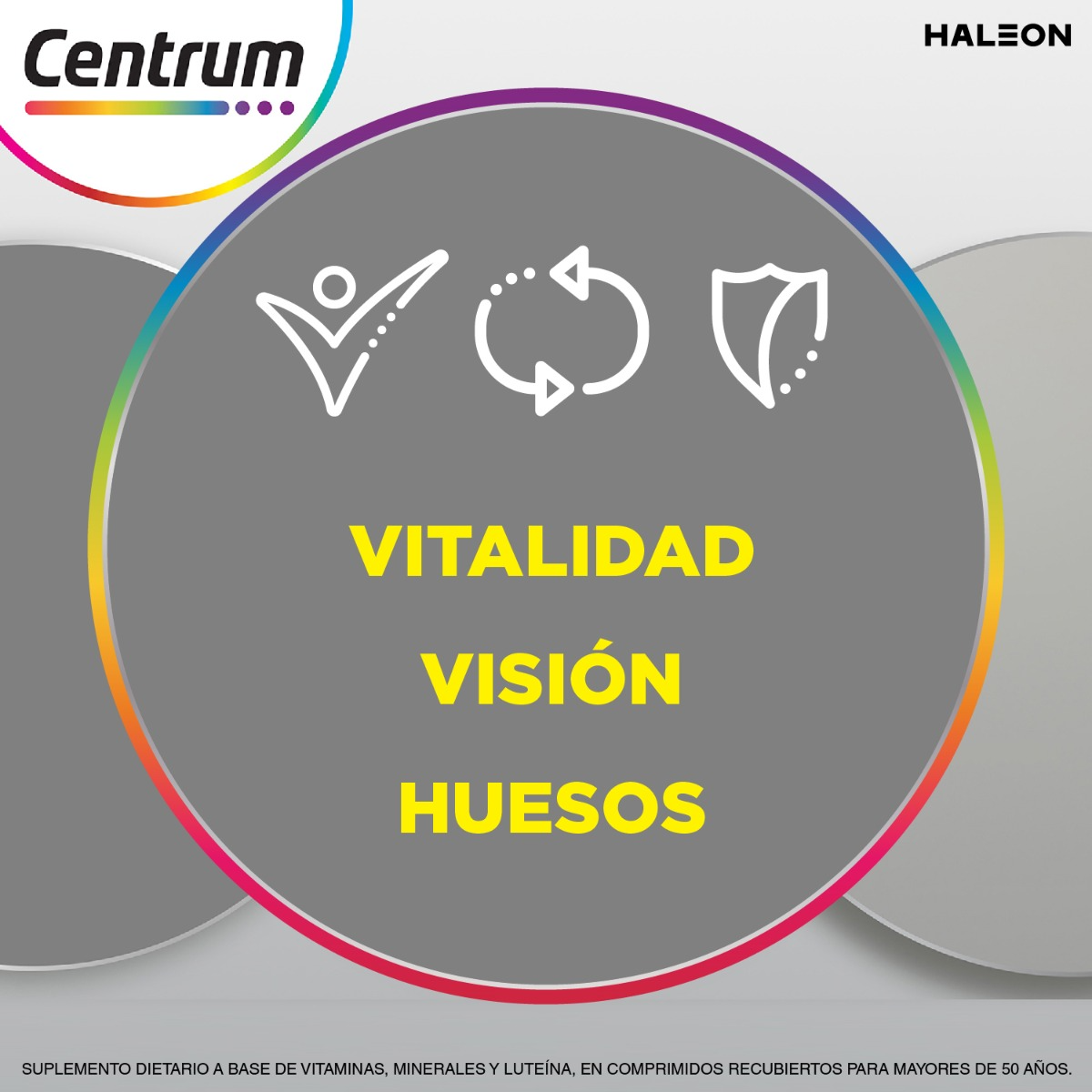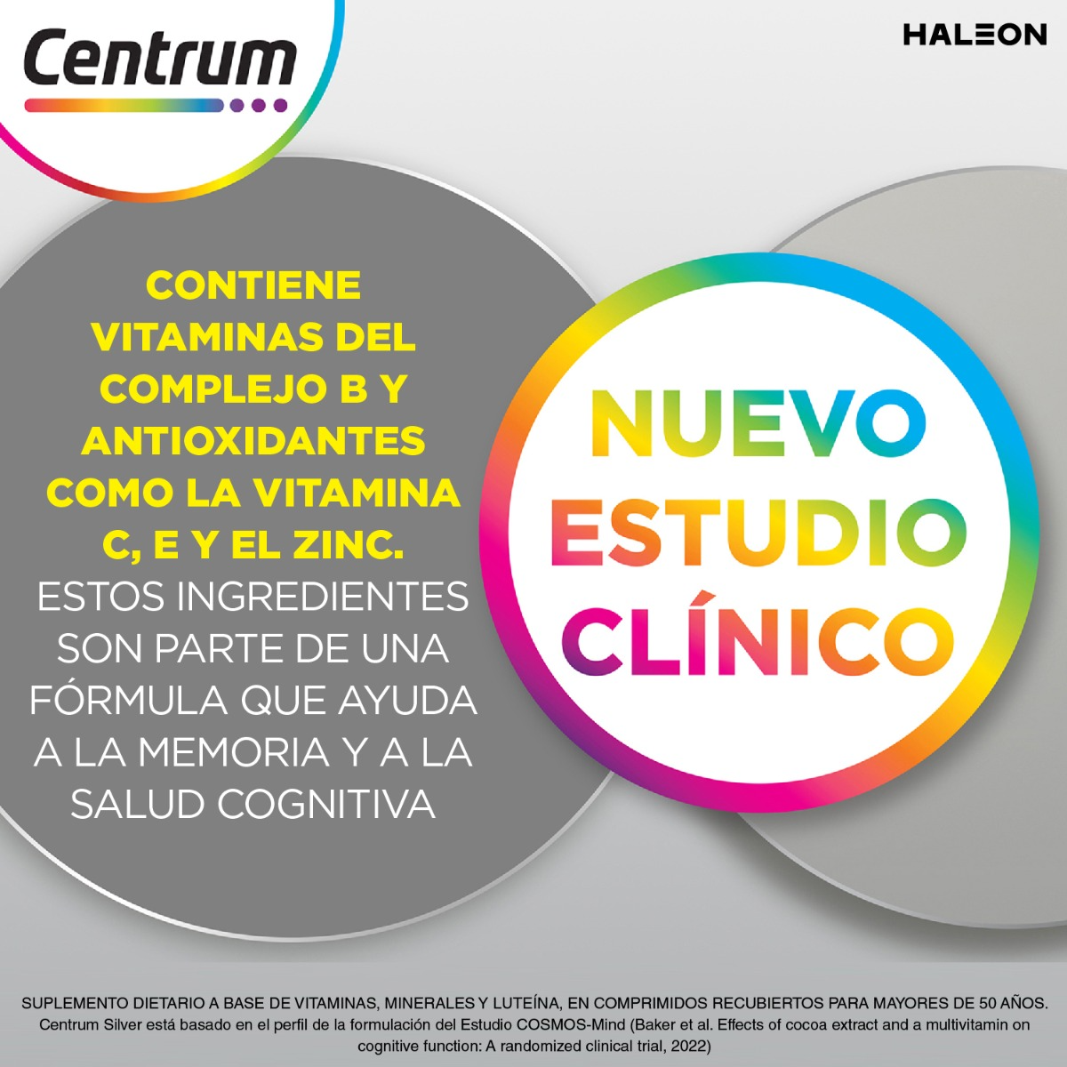 Centrum Silver es un suplemento dietario con Vitaminas y Minerales, especialmente formulado para ayudar a satisfacer las necesidades nutricionales de los mayores de 50 años. Suplemento dietario a base de vitaminas y minerales en comprimidos recubiertos. Centrum Base es un multivitamínico-multimineral, con 13 vitaminas y 11 minerales.Fórmula completa de la A al ZINC.Centrum es el multivitamínico #1 en ventas en el mundo.