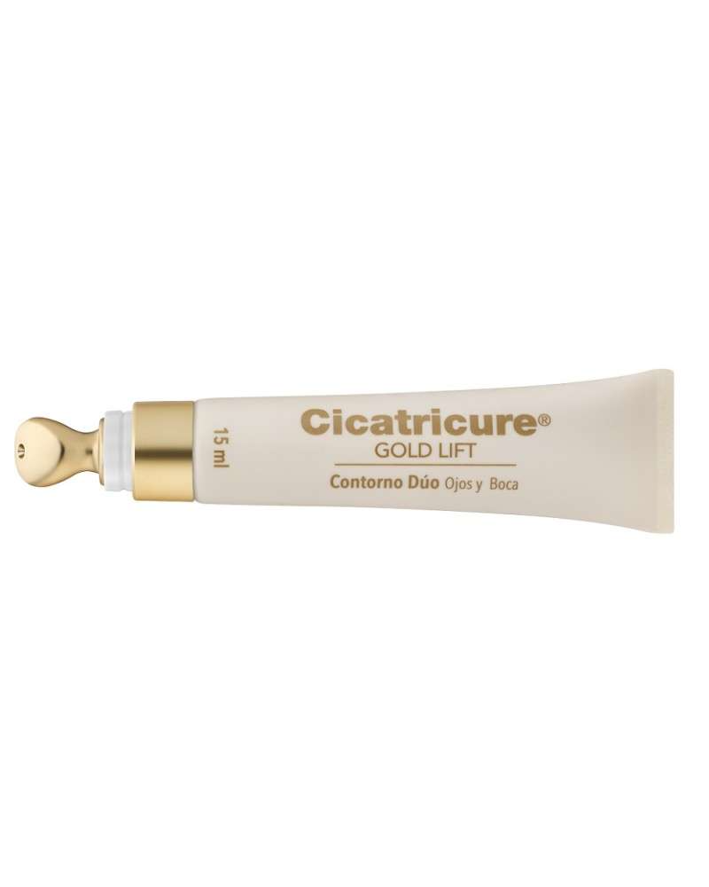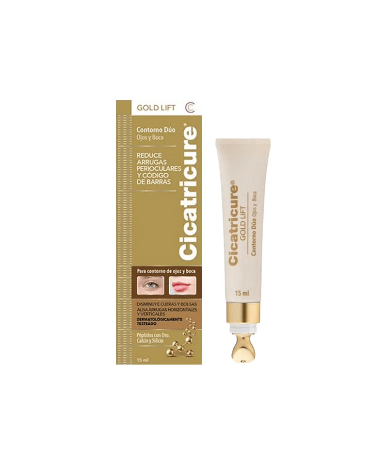 Cicatricure Gold Lift Contorno Duo para ojos y boca reduce arrugas perioculares y codigo de barra. Combina Péptidos con Oro, Calcio y Silicio más un ingrediente activo que actúa como un Self-Filler cutáneo. Eficacia comprobada en: Ojeras, Bolsas, Arrugas perioculares (Patas de gallo), Arrugas verticales (Código de barras). USO DIARIO Utilizar dos veces al día, en la mañana y en la noche, sobre piel limpia y seca, aplicando pequeñas gotas alrededor de los ojos y la boca.