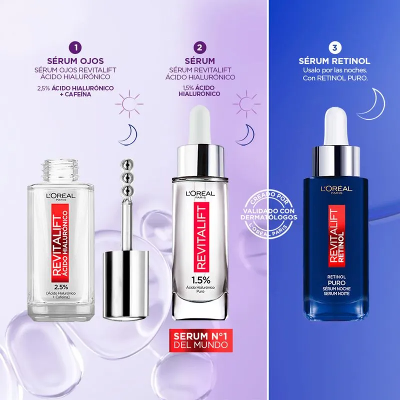 Combo Triple Sérum L’Oreal Paris: Serum Retinol + Serum Acido Hialurónico + Serum Ojos