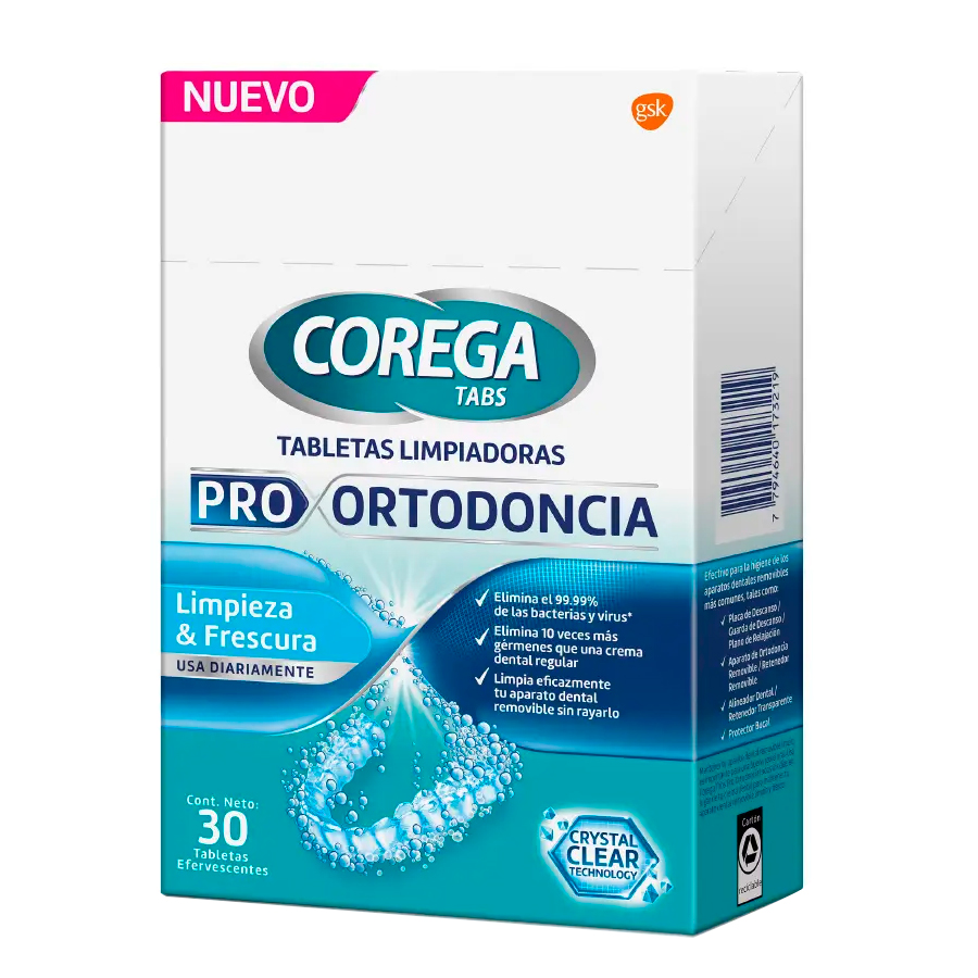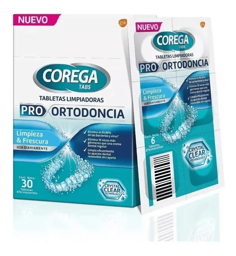 Las pastillas limpiadoras diarias antibacterianas Corega pro ortodoncia han sido desarrolladas con la tecnología Crystal Clear. Ayuda a mantener tu aparato dental con el mejor aspecto, cuando se utiliza según las instrucciones. La formulación del limpiador está diseñada para eliminar las manchas, ayudar a recuperar el color original y también eliminar las bacterias que causantes del mal olor y virus.