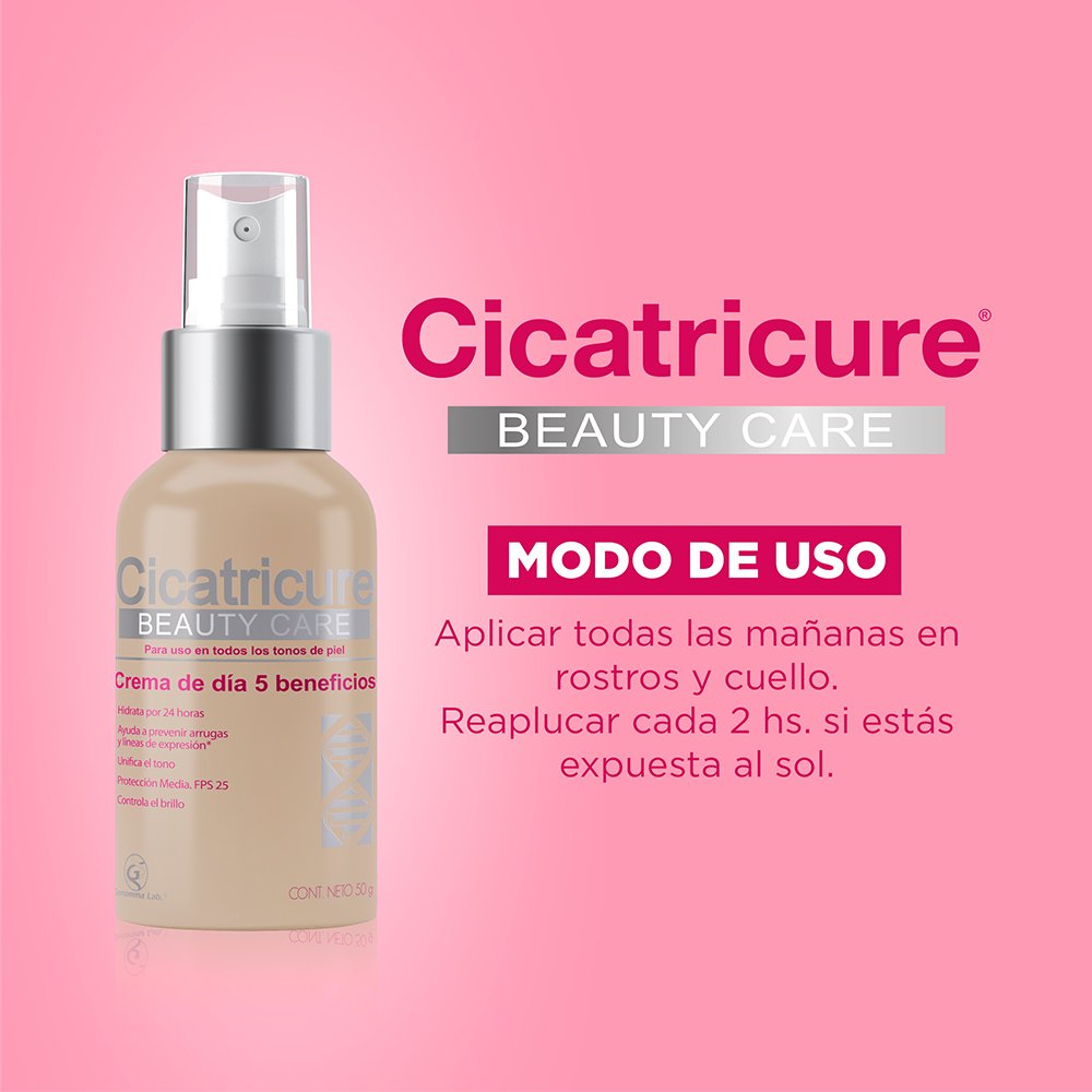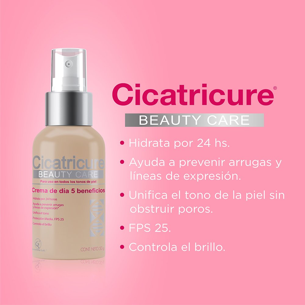 Cicatricure Beauty Care es una crema facial de día con una exclusiva fórmula que reúne los 5 cuidados que la piel necesita en 1 solo paso: Hidrata por 24 horas. Previene arrugas y líneas de expresión. Unifica el tono. Tiene FPS 25. Anti brillo. Para uso en todos los tonos de piel.