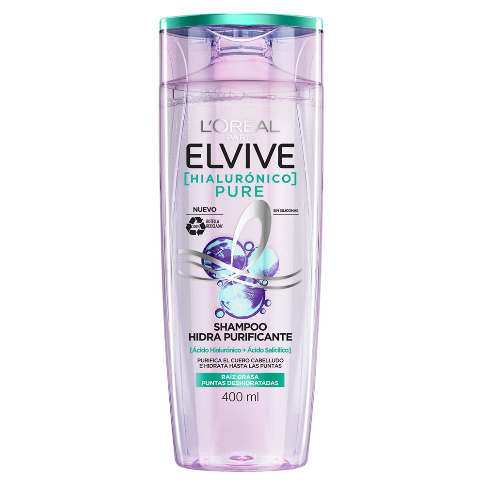 Descubre el Nuevo Elvive A.H. Pure de L’Oréal Paris, la nueva línea para pelo graso y puntas deshidratadas. Con el shampoo Hidra Purificante consigue un control de grasa, raíces purificadas y puntas hidratadas con su fórmula doble acción. Ideal para pelo graso con puntas deshidratadas • Shampoo libre de sulfatos Uso diario. Aplicar sobre el cabello húmedo. Masajear suavemente y enjuagar.
