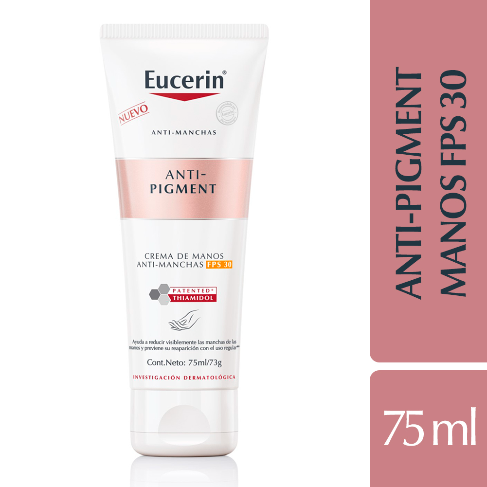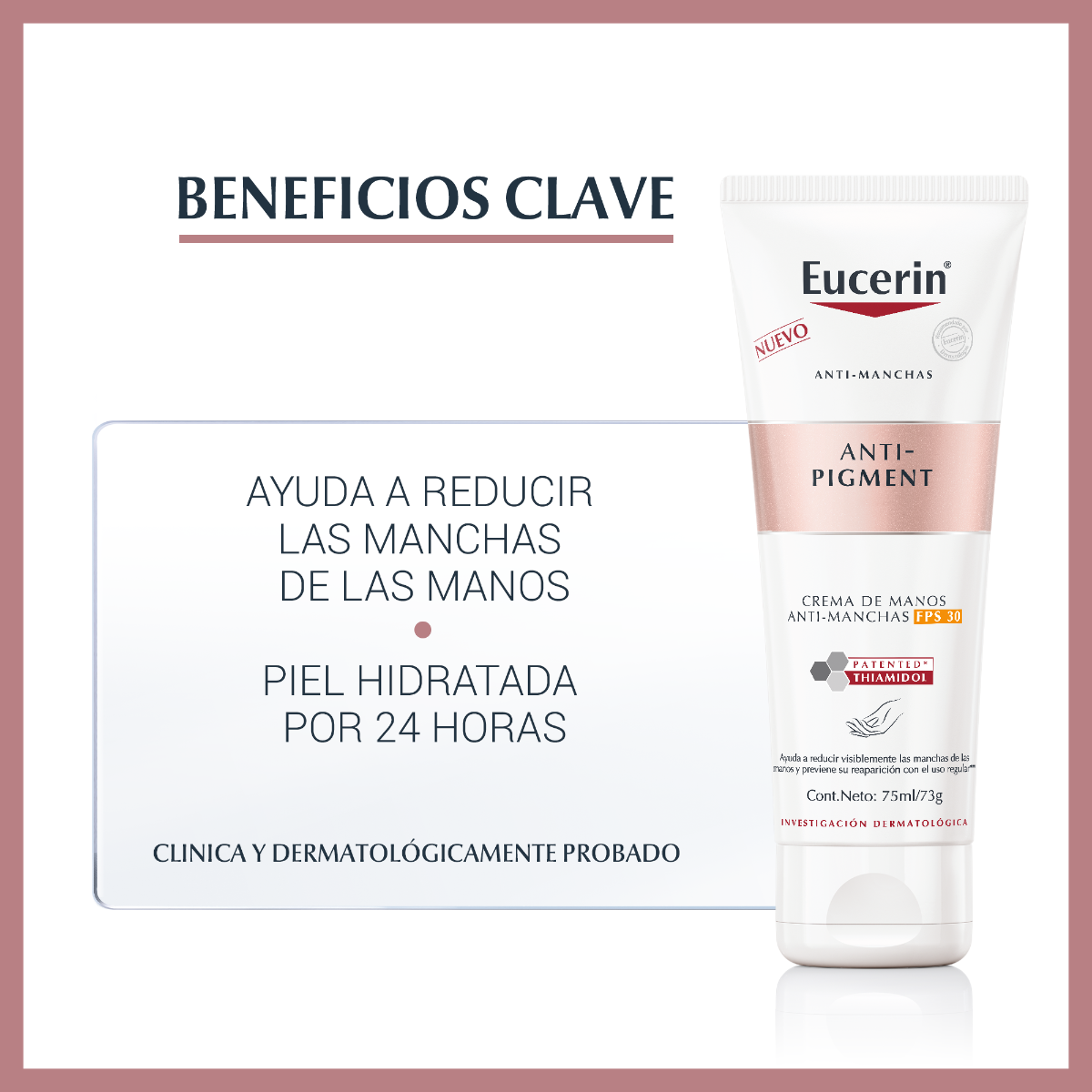 La Crema de manos antimanchas Eucerin ANTI-PIGMENT contiene Thiamidol, un ingrediente eficaz y patentado que actúa en la causa principal de la hiperpigmentación al reducir la producción de melanina. Se ha probado clínica y dermatológicamente que este componente reduce las manchas y previene su reaparición. Además, es una crema de rápida absorción que hidrata por 24 horas.