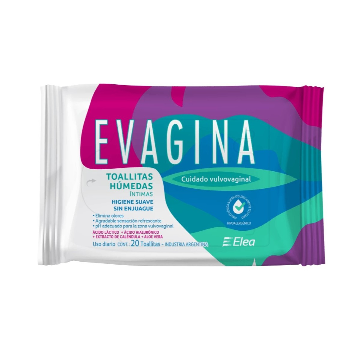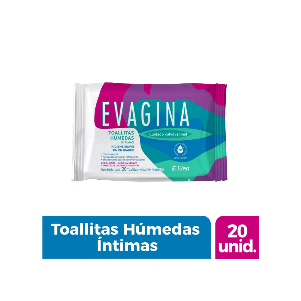 EVAGINA TOALLITAS HÚMEDAS DE HIGIENE ÍNTIMA X 20 con pH adecuado para la zona vulvovaginal para higienizar suavemente dejando una agradable sensación de frescura. Por su exclusiva formulación hidrata, calma y suaviza la zona.