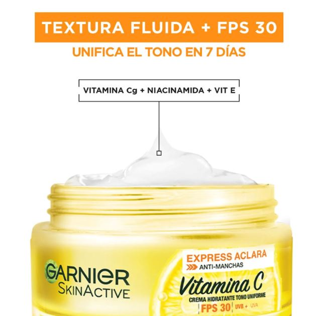 Probá la nueva crema hidratante textura ligera de Garnier con FPS30. Esta crema hidrata, protege y unifica el tono de la piel en 7 días*. Formulada con vitamina Cg, niacinamida y vitamina E.