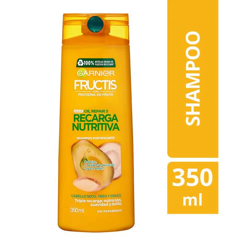 Cabello 3 veces más nutrido. Fórmula sin parabenos para cabello seco. Con aceite de oliva, palta y karité para reparar, sellar y nutrir.