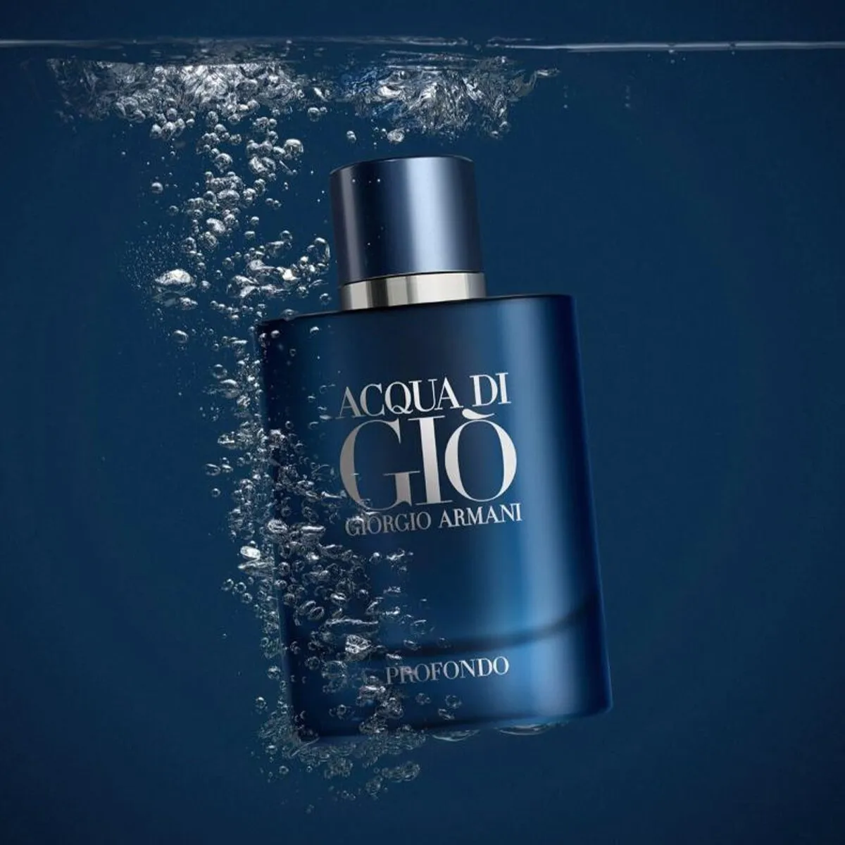 Esta fragancia cautivadora evoca una faceta densa, resinosa y mineral de Acqua Di Giò. Estas notas, creadas en torno a notas de bergamota, absoluto balsámico de jara y la riqueza de una esencia de hipérico, prestan su profundidad e intensidad a Acqua Di Giò Profondo Parfum. La fragancia evoca la infinidad del océano y se presenta en un frasco azul oscuro, con un tono que pasa del azul más oscuro en la parte superior al turquesa traslúcido en la inferior.
