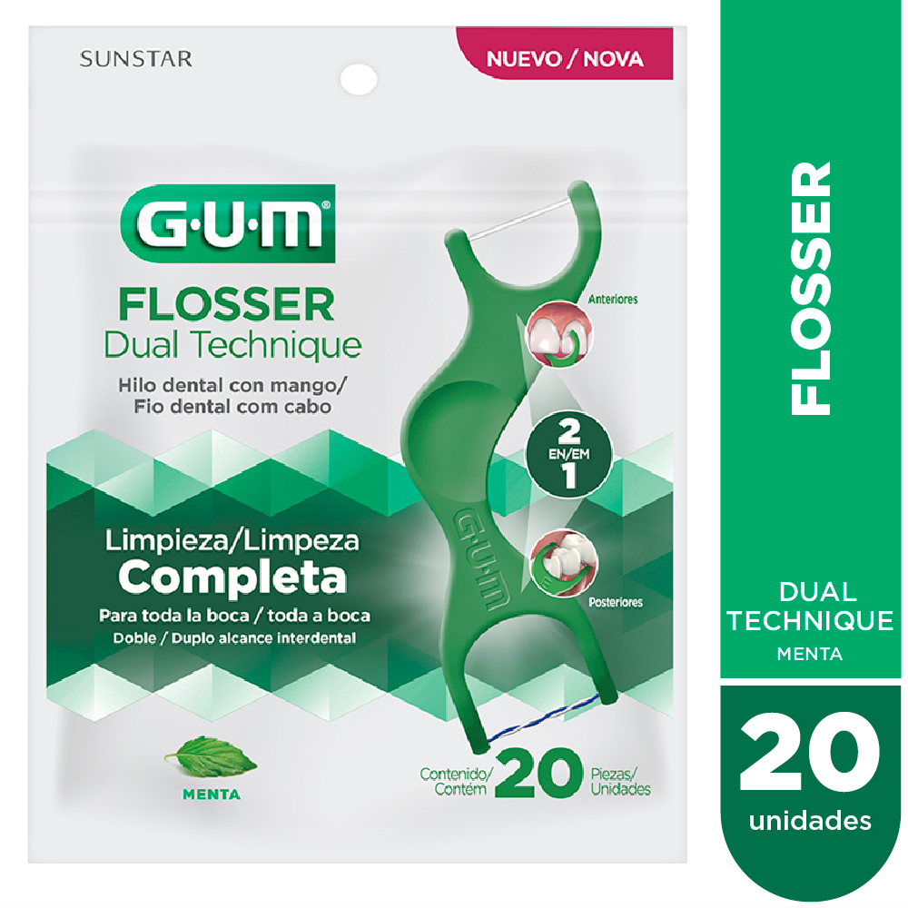 Los Flossers GUM Dual Technique están diseñados para la limpieza de los dientes delanteros y traseros con hilo dental retorcido y resistente a los desgarros con sabor a menta. Cubre un 30% más de superficie y se desliza cómodamente entre los dientes.