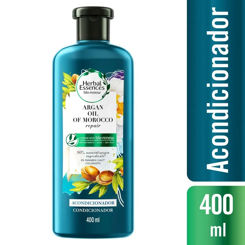 El acondicionador para cabello maltratado Herbal Essences Argan Oil of Morocco se ha elaborado especialmente a partir de ingredientes inspirados en la naturaleza para reparar el cabello dañado. Elaborado con bio:renew, una mezcla exclusiva de antioxidantes esenciales, aloe vera y algas marinas. Aplicar una cantidad generosa de acondicionador sobre el pelo mojado desde la raíz hasta las puntas y enjuagar.
