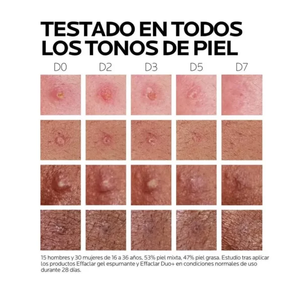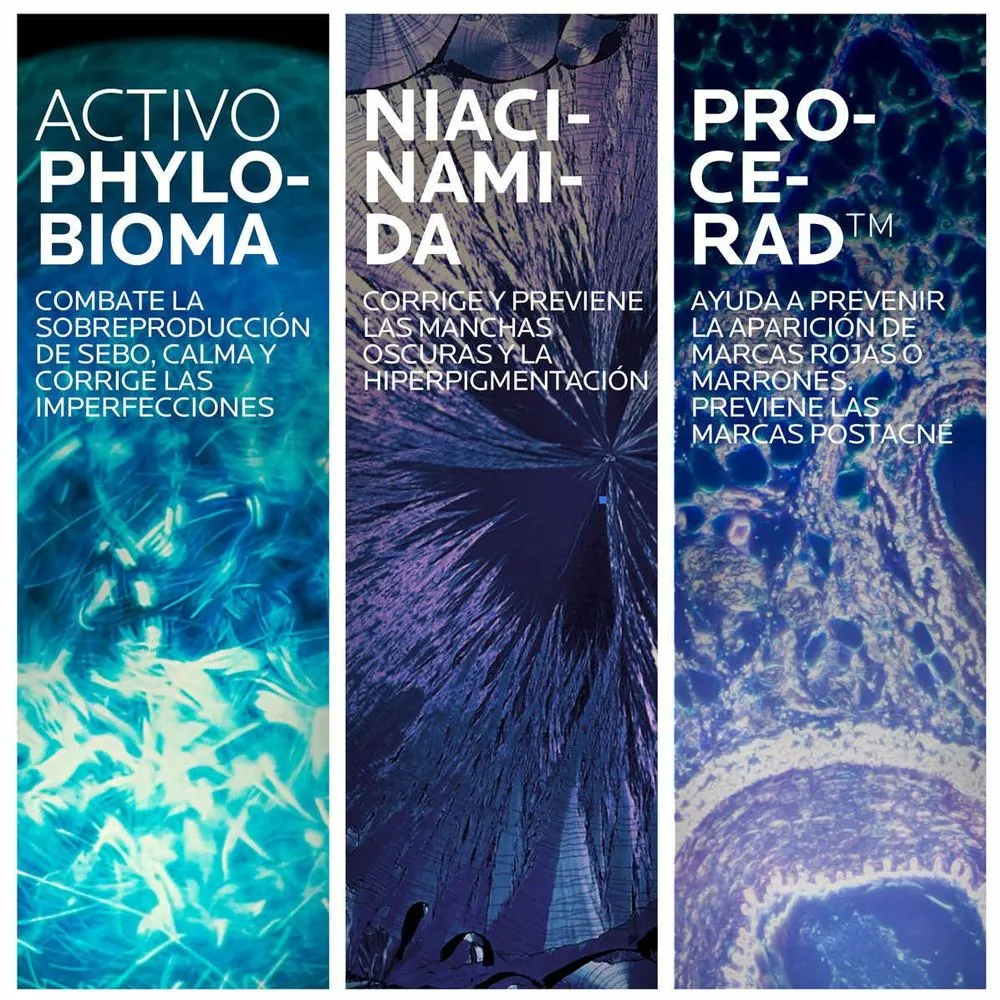 Corrige el acné y los puntos negros previniendo su reaparición. Disminuye las marcas provocadas por el acné. A partir de las 12 horas de uso, la piel se encuentra menos enrojecida y más uniforme. Tratamiento para pieles con acné leve a moderado.