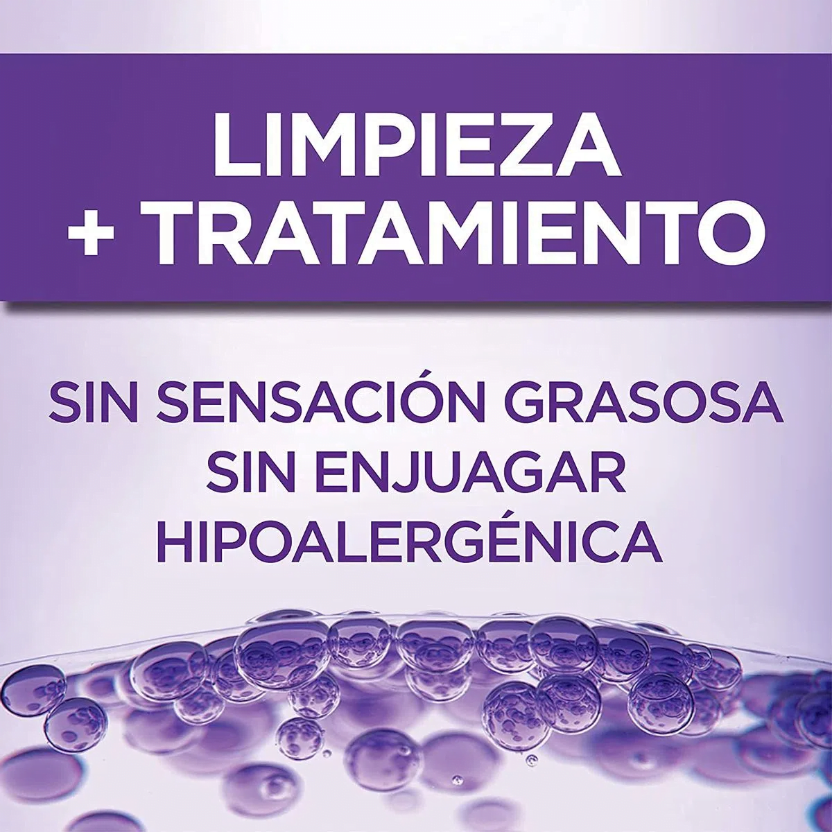 Agua Micela. Limpia, desmaquilla e hidrata intensamente rellenando líneas de expresión en un solo paso. Sin perfume, ni alcohol. Hipoalergénica y para todo tipo de piel. Su fórmula enriquecida pura cumple acción 3 en 1: limpia, purifica y rellena la piel con hidratación. En un solo paso, el Agua Micelar limpia y remueve eficazmente el maquillaje de rostro, ojos y labios sin resecar la piel