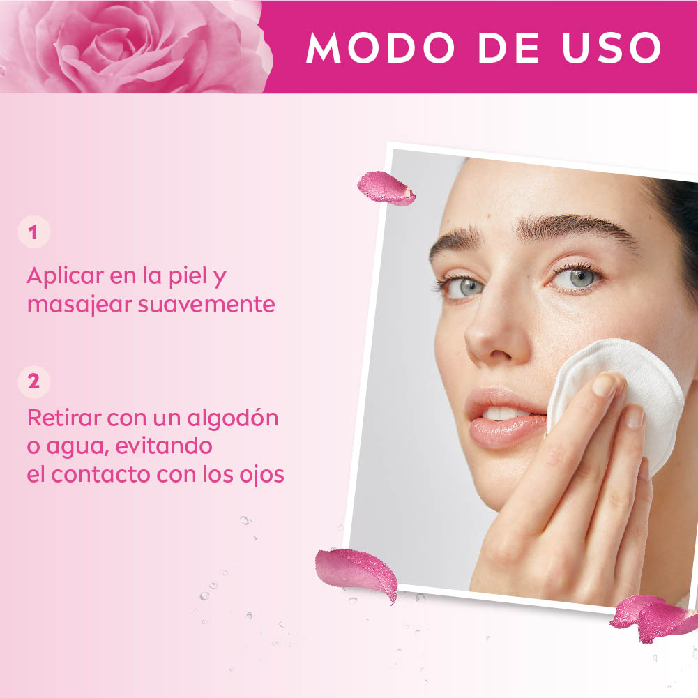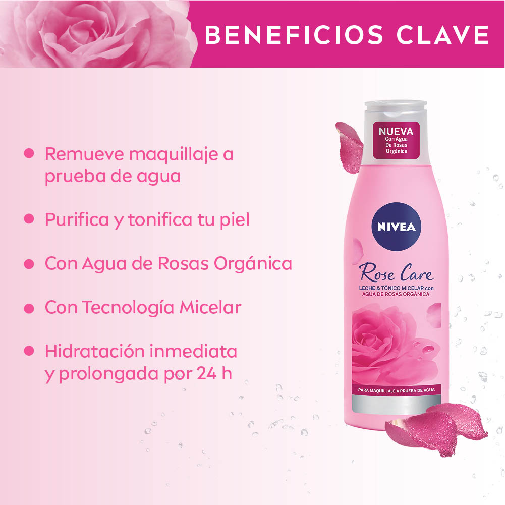 Leche y tónico micelar 2 en 1 NIVEA Rose Care retira suavemente el maquillaje a prueba de agua sin frotar ni enjuagar. Además, limpia profundamente, purifica y tonifica la piel sin resecarla. Su fórmula contiene Agua de Rosas Orgánica, un antioxidante que entrega hidratación inmediata y prolongada por 24 horas. La piel luce suave y humectada. BENEFICIOS – 24 horas de hidratación intensa e inmediata – Remueve efectivamente el maquillaje a prueba de agua – Purifica y tonifica la piel – Con Agua de Rosas Orgánica: Mantiene el PH de la piel – Piel suave, limpia y sin residuos
