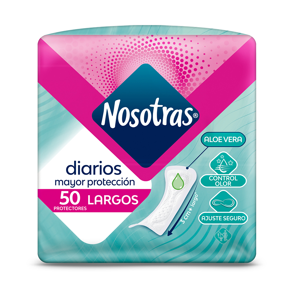 Protectores Diarios Nosotras largos x 50 unidades. Absorben la humedad diaria, así estarás más segura y tu ropa interior siempre protegida.