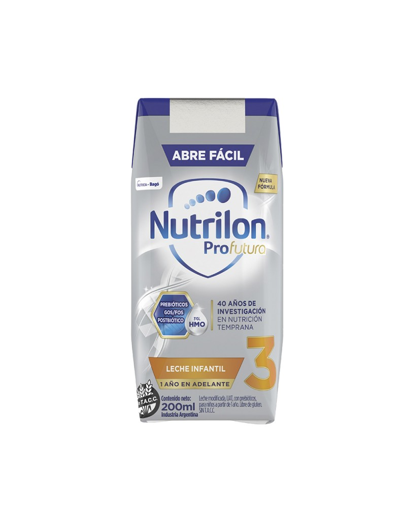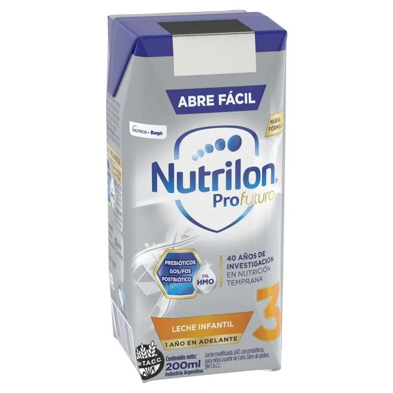 Leche modificada, UAT, con prebióticos, para niños a partir de 1 año. Libre de gluten. Sin T.A.C.C. Mezcla única patentada de GOS/FOS* actúa sobre el sistema inmune. LCPs: DHA + EPA: ác-idos grasos que actúan en el cerebro y el sistema inmune. Contenido proteico adaptado a las necesidades del niño. Galacto-oligosacáridos y Fructo-oligosacáridos.
