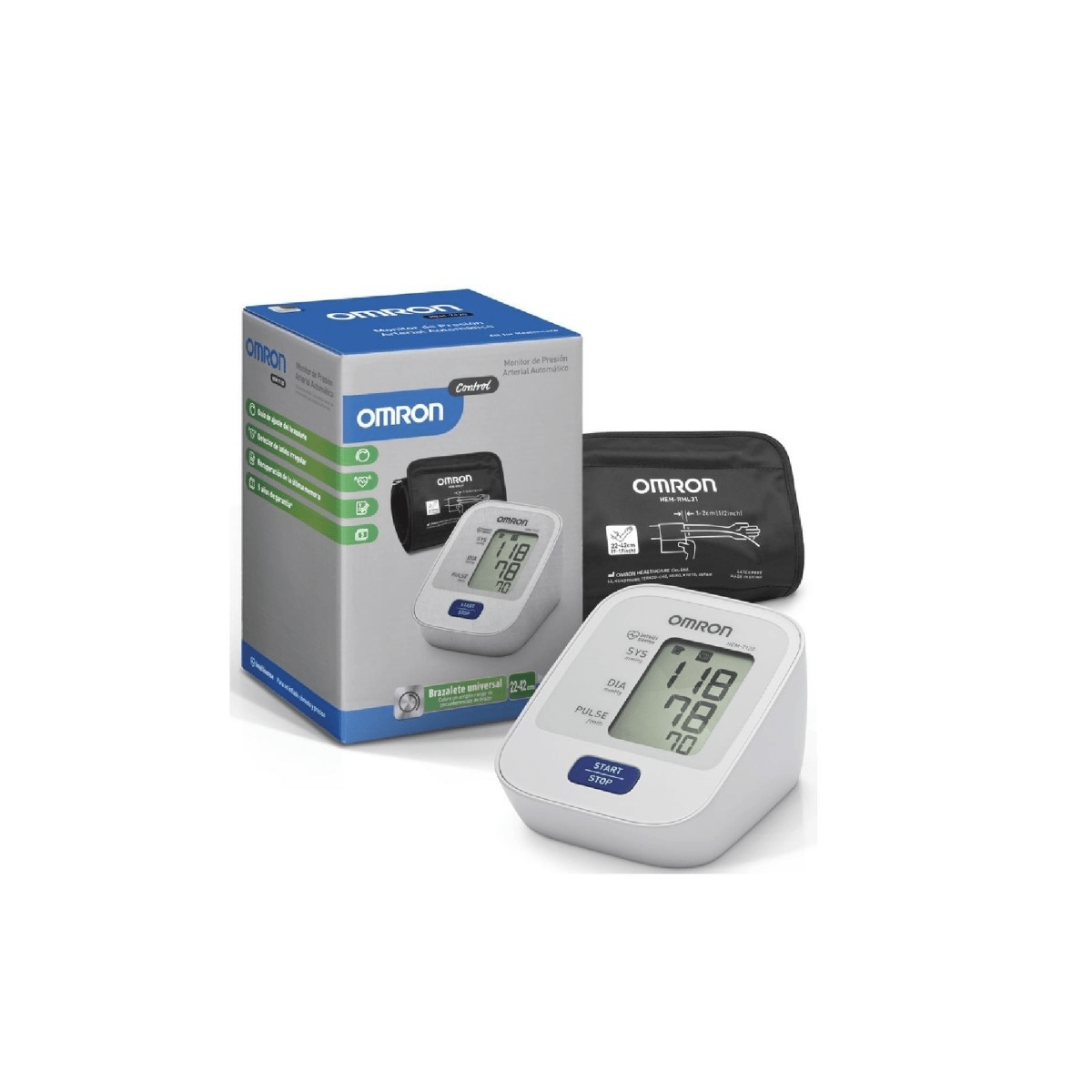 El Monitor de Presión Control alerta al usuario cuando detecta Error de Movimiento y su Guía de Ajuste de Brazalete avisa cuando no está colocado adecuadamente. Cuenta con un Brazalete Universal que se ajusta fácil y cómodamente a brazos de 22 a 42 cm de circunferencia.
