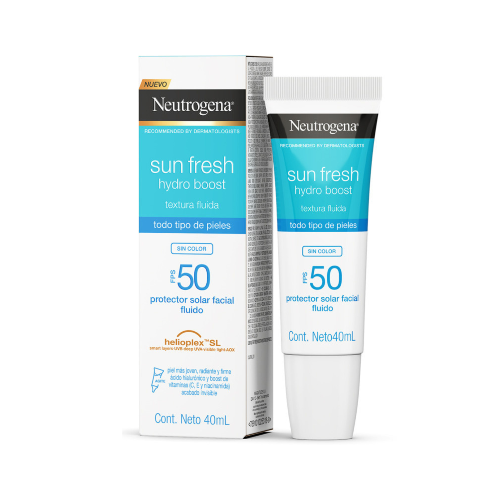 Nuevo protector solar facial NEUTROGENA SUN FRESH® Hydro Boost FPS 50+. Con textura ultra fluida, para todo tipo de piel. Su exclusiva tecnología HELIOPLEX? SL ofrece una protección muy alta, formando una barrera protectora contra los rayos UV, la luz visible y la polución.