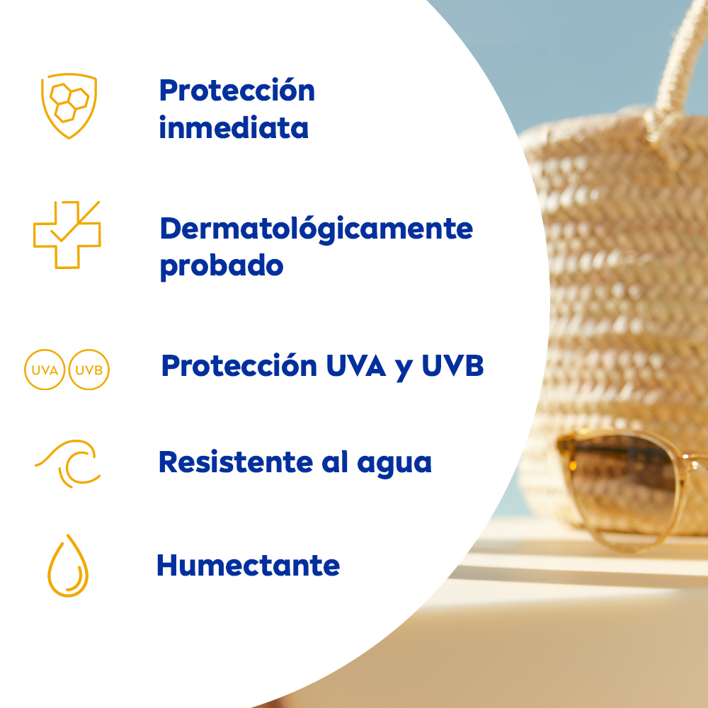 El Protector solar en loción NIVEA Protect & Hydrate es fundamental para el cuidado de la piel, ya que la protege al instante de los rayos de sol. Su fórmula combina Pantenol y Glicerina, ingredientes que ayudan a mantener los niveles de hidratación y reducen la pérdida de agua. Esta loción solar con FPS 50 se absorbe rápidamente, aportando protección inmediata y es resistente al agua. Es apto para todo tipo de pieles.