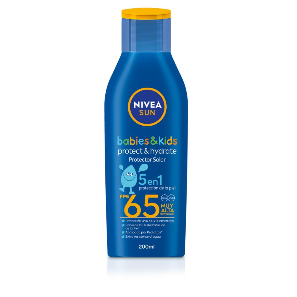 El Protector solar NIVEA SUN Babies & Kids Protect & Hydrate 5 en 1 protege de forma inmediata de las quemaduras solares. Su fórmula es compatible para la delicada piel de los niños mayores de 3 años. Contiene FPS 65 y brinda protección UVA/UVB inmediata. Está aprobado por pediatras, previene la deshidratación de la piel y es extra resistente al agua.